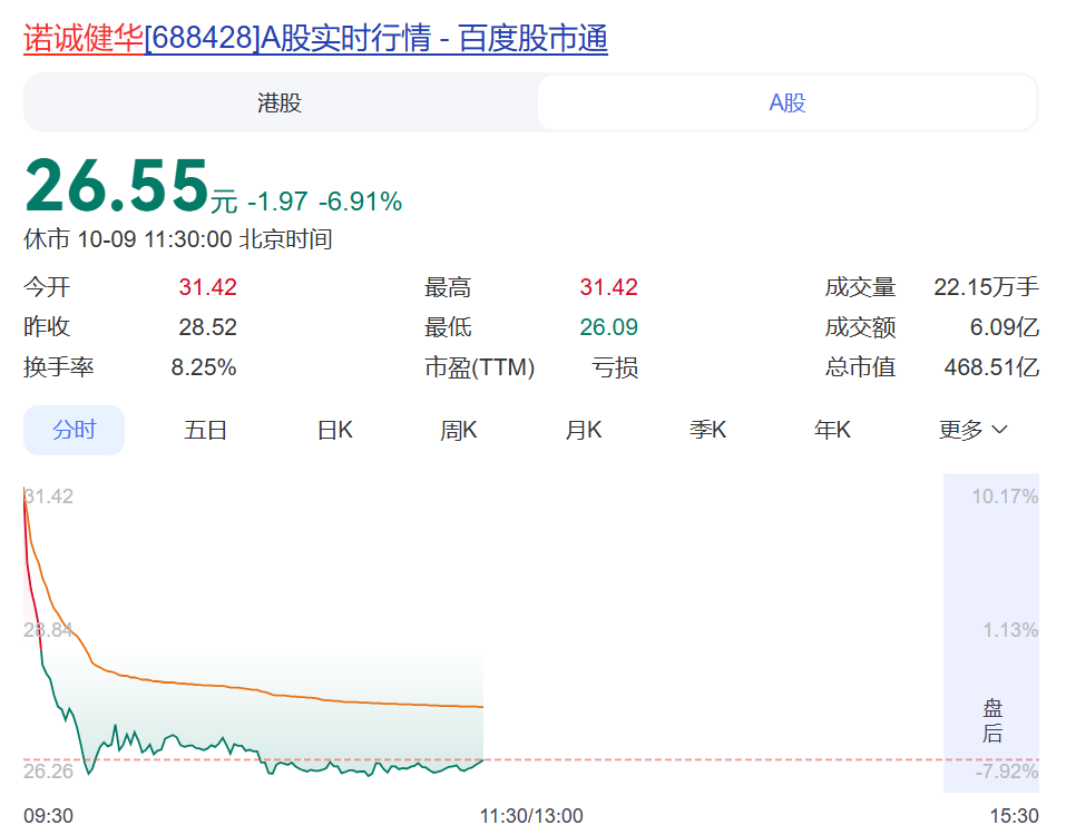 10月9日,诺诚健华股价开盘跳水,截至中午收盘,其A股股价跌近7%,港股股价跌近10%。不过,年初至今其A股和港股股价均已翻倍。