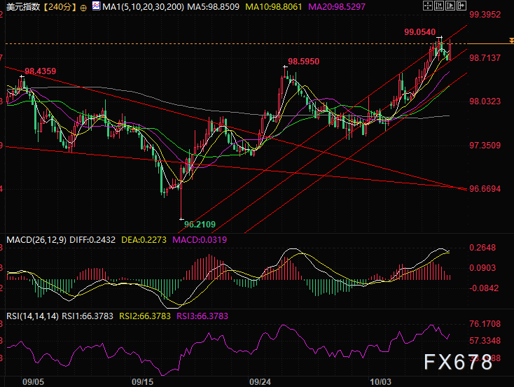 汇通财经APP讯——周四(10月9日)亚欧时段继续上涨,目前涨0.16%,交投于98.99附近。美元指数自96.21后大幅反弹,这次又已经走出四连阳,但其实市场上并没有太多利好美国的数据发布。