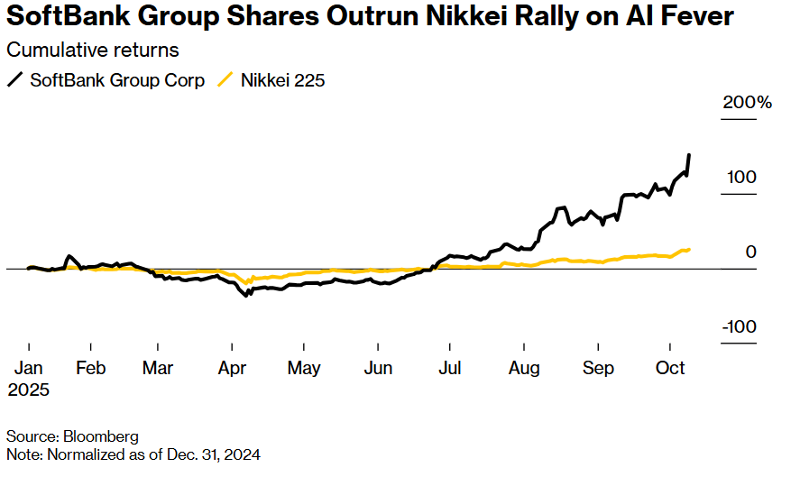 在甲骨文与软银共同合作提供 *** 云与AI算力服务,以及软银计划收购ABB集团机器人业务的消息提振市场对软银人工智能业务利润增长的预期,再加之全球资金对于AI算力产业链投资情绪持续升温,软银股价周四在日本股市一度涨超13%再创历史新高,年内涨幅高达150%,大幅跑赢日经225指数。在美股市场,软银集团ADR(SFTBF.US)交易价格今年以来同样屡创新高,2025年迄今涨幅高达140%,大幅跑赢纳斯达克100指数。