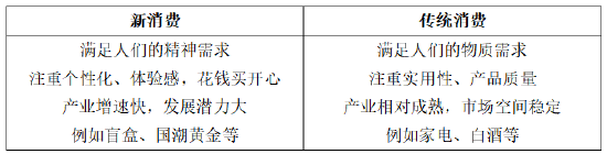 一代人有一代人的“茅台”,所谓新消费,其实是一个相对概念。在传统消费中,其满足的是人们日常衣食住行方面的物质需求,涉及的行业有家电、白酒、服装等;而新消费更多是满足人们的精神需求,例如抽盲盒、养宠物等,主打一个提供情绪价值。