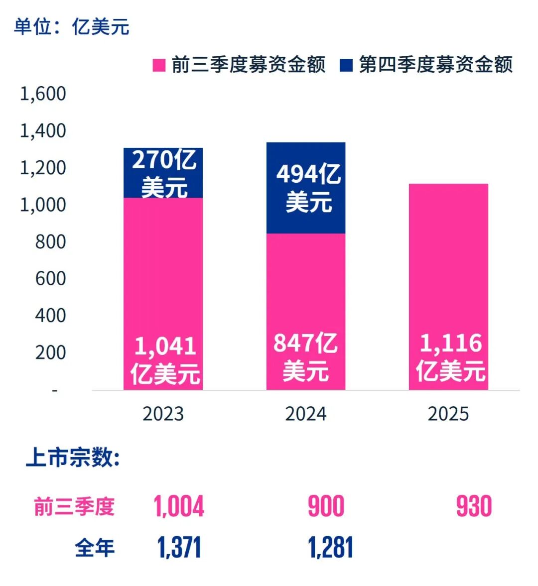 募资总额1,116亿美元,与2024年前三季度相比增加约30%