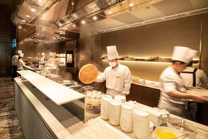 此次大韩航空对仁川贵宾室进行了全面高端化升级。贵宾室内不仅设有开放式厨房,更特别引入首尔君悦酒店现任厨师团队驻场,打造“Live Station”餐饮服务,为旅客提供即点即制的新鲜餐食。餐饮区采用分区设计,涵盖韩餐、西餐、烘焙及沙拉吧等特色专区,香气与精致摆盘相得益彰,营造出星级酒店般的奢华氛围。