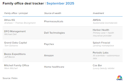 • 但杰夫・贝佐斯(Jeff Bezos)、迈克尔・(Michael Dell)等富豪的家族办公室仍在敲定备受关注的大额融资交易,或进行 opportunistic 投资(伺机投资)。