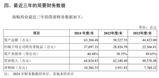 资料显示,海鲸药业是一家研发驱动型的现代医药高新技术企业,公司业务格局以制药业务为主、药学研究与CDMO(合同研发生产组织)业务为辅,其核心产品维生素D2软胶囊在院内处方市场占据重要份额。近三年,海鲸药业业绩呈现稳健增长态势。其营业收入从2022年的4.86亿元持续增长至2024年的6.48亿元,2024年净利润达到1.04亿元。