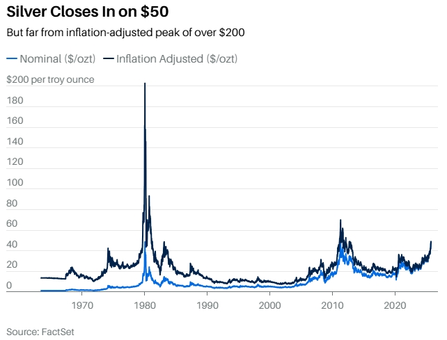 白银价格正上演40年来罕见的暴涨行情。在黄金价格突破4000美元/盎司后,白银跟随其后强势上攻,本周盘中一度突破50美元/盎司,创下自2011年以来新高,现货白银年内累计涨幅超70%,显著超过黄金的51.5%。这是自1979年以来白银年度表现最亮眼的一年。