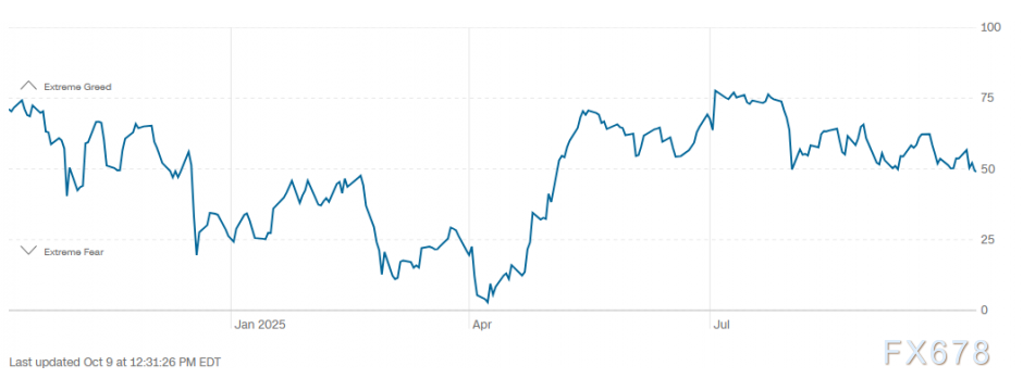 当前持续的美国 *** 停摆事件,引发了人们对政治和体制风险的担忧,略微挫伤了市场信心。这一影响可以在“恐惧与贪婪指数”中观察到:市场情绪已呈现稳定的下降趋势,正逼近50点水平,逐渐接近“恐惧”区间。