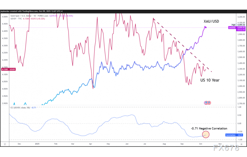 持续存在的降息预期已导致10年期美债收益率稳步下行,目前徘徊在4%关口附近。在此背景下,黄金作为避险资产及债券的天然替代品,正从收益率回落中受益,这有力支撑了其需求表现。过去50个交易日内,两类资产的相关系数达-0.71,显现出强烈的负相关关系——债券收益率下跌总是伴随着金价上扬。这表明资金从固定收益市场向黄金的轮动仍在持续支撑需求,不过这种关联性或将随市场环境变化而改变。