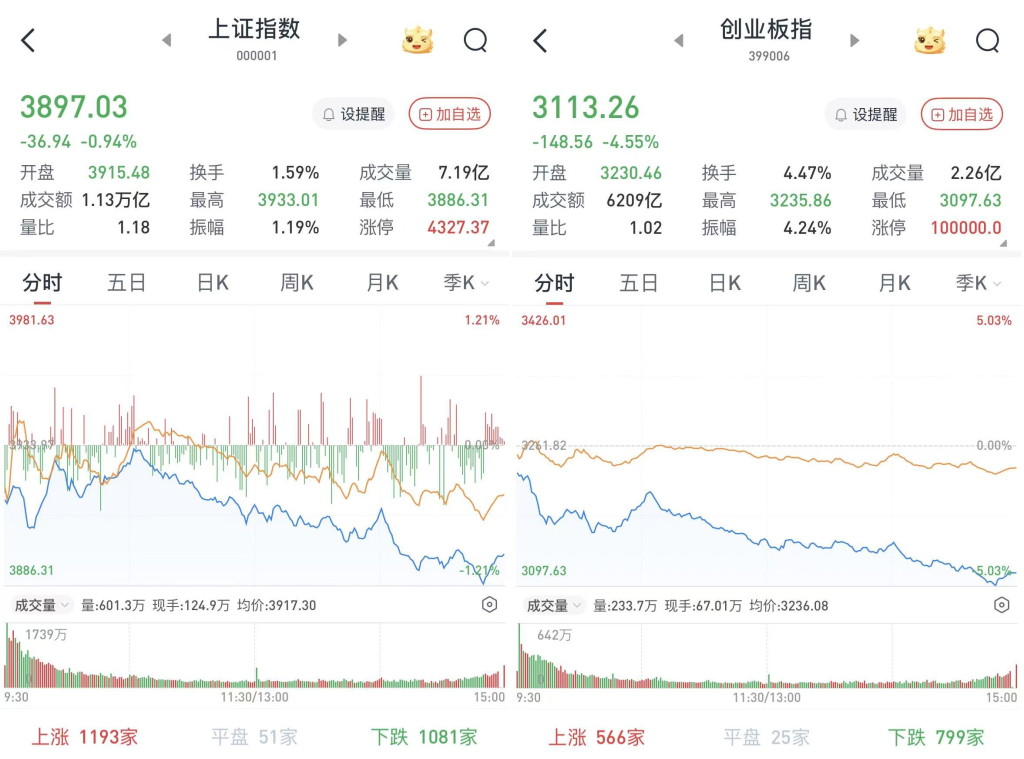 至收盘,上证综指跌0.94%,报3897.03点;科创50指数跌5.61%,报1452.68点;深证成指跌2.7%,报13355.42点;创业板指跌4.55%,报3113.26点。