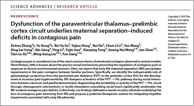 10月9日,国家儿童医学中心、上海交通大学医学院附属上海儿童医学中心发育行为儿科江帆教授、浙江省瓯江实验室刘明刚研究员与上海交通大学医学院徐天乐教授团队合作,在国际顶级期刊《科学·进展》上发表研究论文。该研究首次系统阐明,生命早期的母婴分离应激如何导致成年后对同伴疼痛“感同身受”的能力下降,其关键在于大脑中“丘脑室旁核-前边缘皮层”这一神经环路的功能失常。