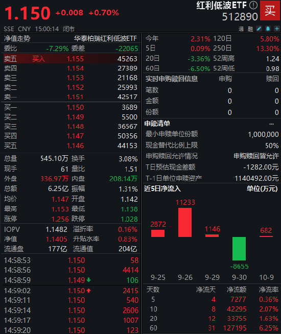 从资金流向来看,红利低波ETF近期持续受到资金青睐。近10个交易日资金净流入4.2亿元,近20个交易日净流入3.4亿元,近60个交易日累计净流入12.72亿元。截至2025年10月9日,该ETF流通规模已达202.03亿元。