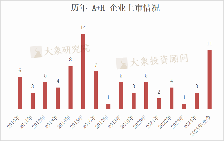 2025年成为A+H上市潮的“加速年”。据统计,自2010年以来,双市场上市企业总数已达82家,今年A+H企业达11家,较2024年新增8家,融资规模同步攀升。