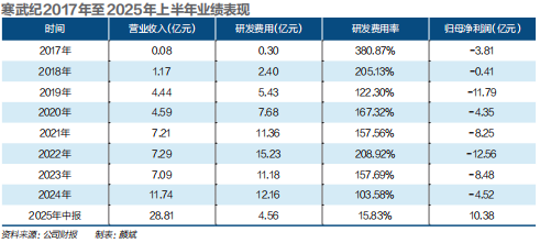 高额的研发投入是寒武纪亏损的主要原因,2017年至2024年,寒武纪研发费用达65.74亿元,而同期营业收入总额为43.6亿元,研发费用常年是营收的1倍-2倍。