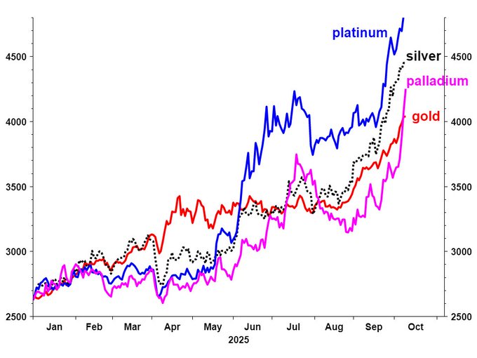 相比之下,黄金表现虽同样亮眼,但涨幅要略逊于白银和铂金。现货金价今年累计上涨了约52%,周二史上首次突破了每盎司4000美元关口。