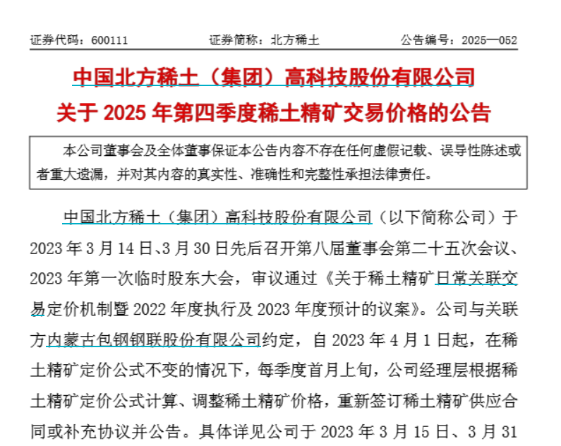 10月10日晚间,、发布公告,上调2025年第四季度稀土精矿关联交易价格。