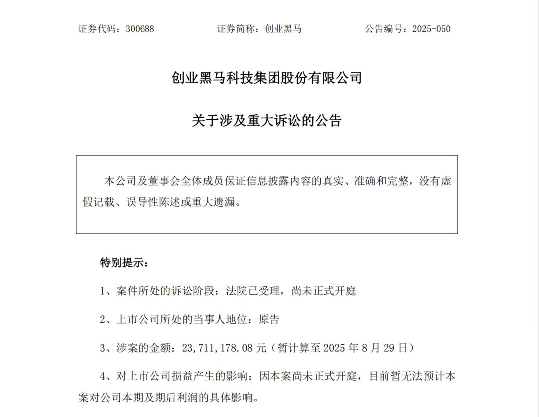 10月11日,创业黑马(300688.SZ)一则公告将其与青岛市崂山区科技创新委员会(下称“崂山区科创委”)的合同纠纷公之于众。根据公告,创业黑马起诉崂山区科创委,涉案金额超2371万元(暂计算至2025年8月29日),崂山区人民法院已受理了该案,尚未正式开庭。