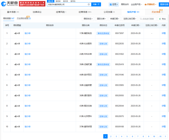 查询企业工商信息可知,“娃小宗”商标分类为啤酒饮料、方便食品、食品与医药,商标申请日期为2025年2月19日。此后,2025年2月至5月,宏胜饮料申请注册了数十个“娃小宗”商标,涵盖餐饮住宿、办公用品、服装鞋帽、教育娱乐等领域。