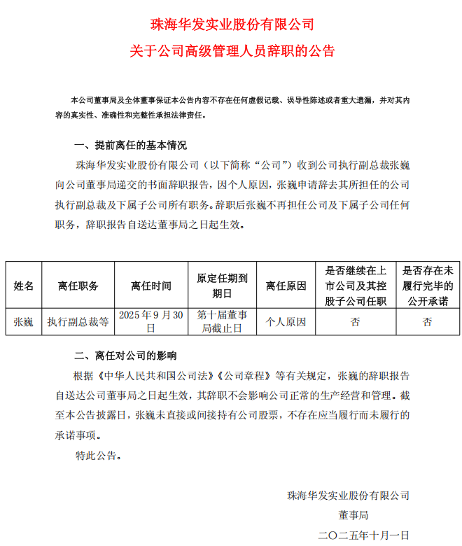 张巍离职后,也不再在华发股份和下属公司担任任何职务,简言之,这是一次非常彻底的告别离场。