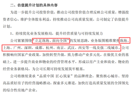 而在华发今年8月全新提出的《估值提升计划》中,虽然依旧延续了“立足珠海、面向全国”的发展思路,但是却不在像以往大提区域,而是明确指出: