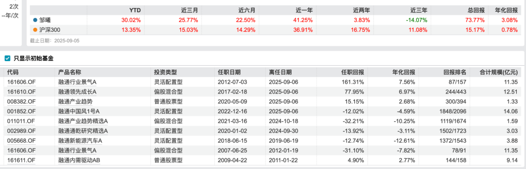 据Wind数据,邹曦历任管理基金数共12只。今年9月6日,邹曦清仓了剩余在管的4只基金,分别为融通行业景气、融通领先成长、融通产业趋势、融通中国风1号。