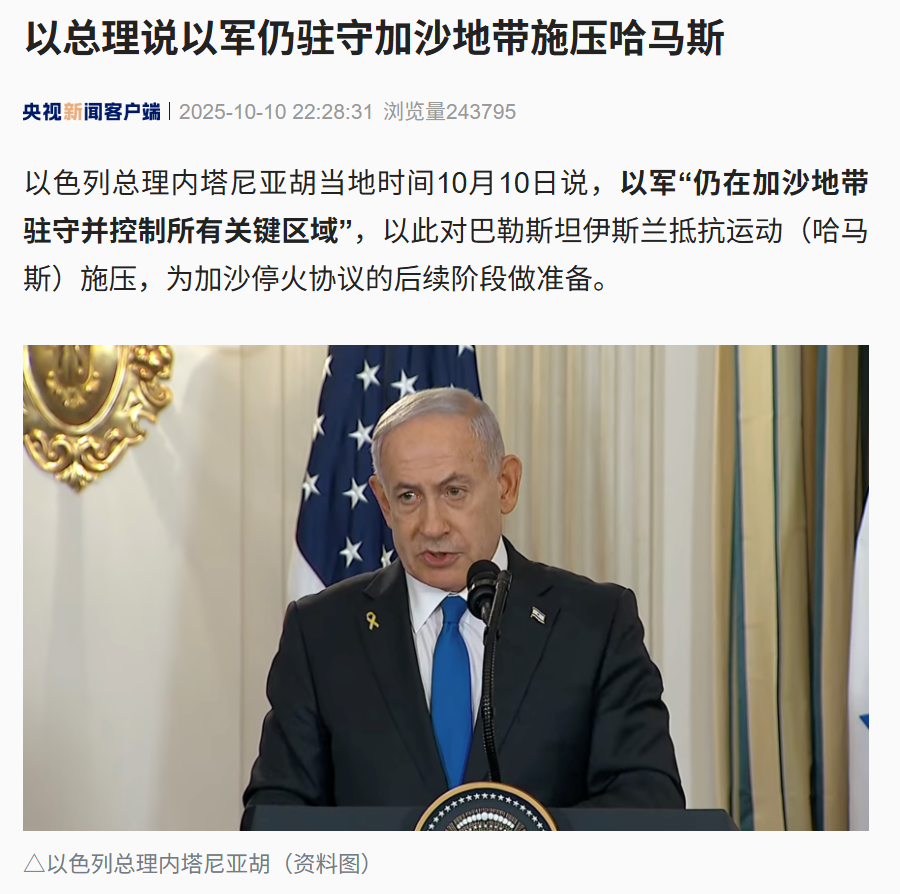 以色列总理内塔尼亚胡当地时间10月10日说,以军“仍在加沙地带驻守并控制所有关键区域”,以此对巴勒斯坦*抵抗运动(哈马斯)施压,为加沙停火协议的后续阶段做准备。