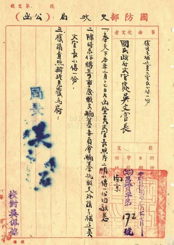 1948年3月吴石给时任国民 *** 文官长吴鼎昌的公函,可见吴石的笔迹与印章。