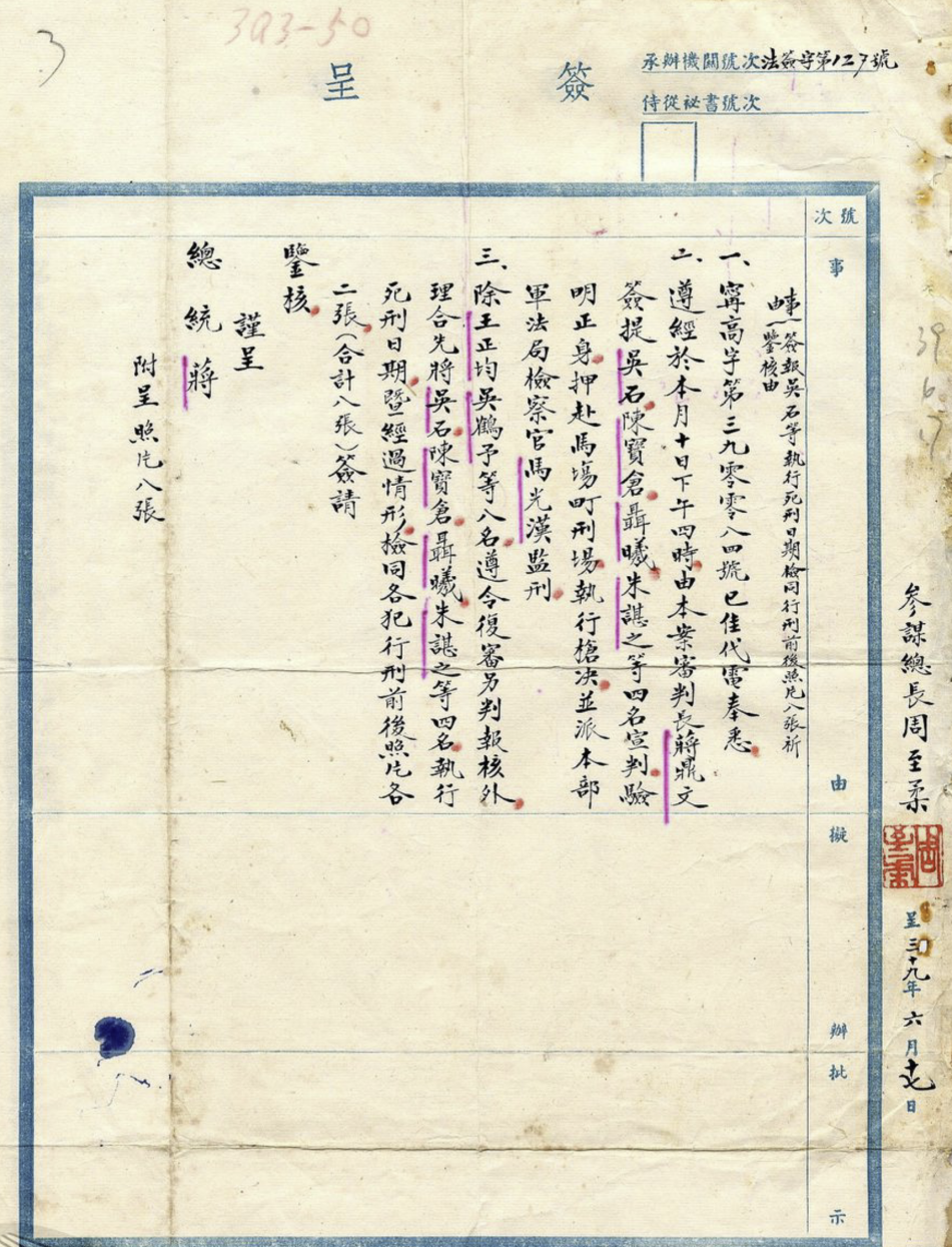 呈递给蒋介石的吴石等烈士的“行刑报告”。