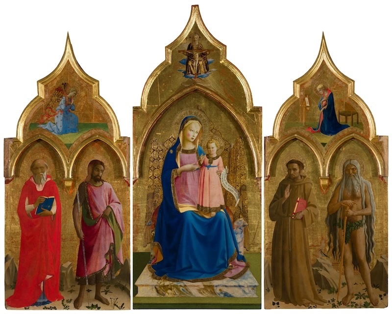 展览开幕前,在特罗齐宫的一面墙上,弗拉·安杰利科创作的《圣马可祭坛画》的中央面板正等待着失落已久的附属部分。这幅画最初是为佛罗伦萨修道院供奉的圣马可高坛而作。其中,描绘“圣母与圣婴并诸天使”的部分从未离开过修道院,但它的侧面面板却辗转于巴伐利亚国王、意大利男高音歌唱家、佛罗伦萨商人、法国伯爵以及美国镀金时代的收藏家手中,并最终流落到世界各地的各大博物馆里。
