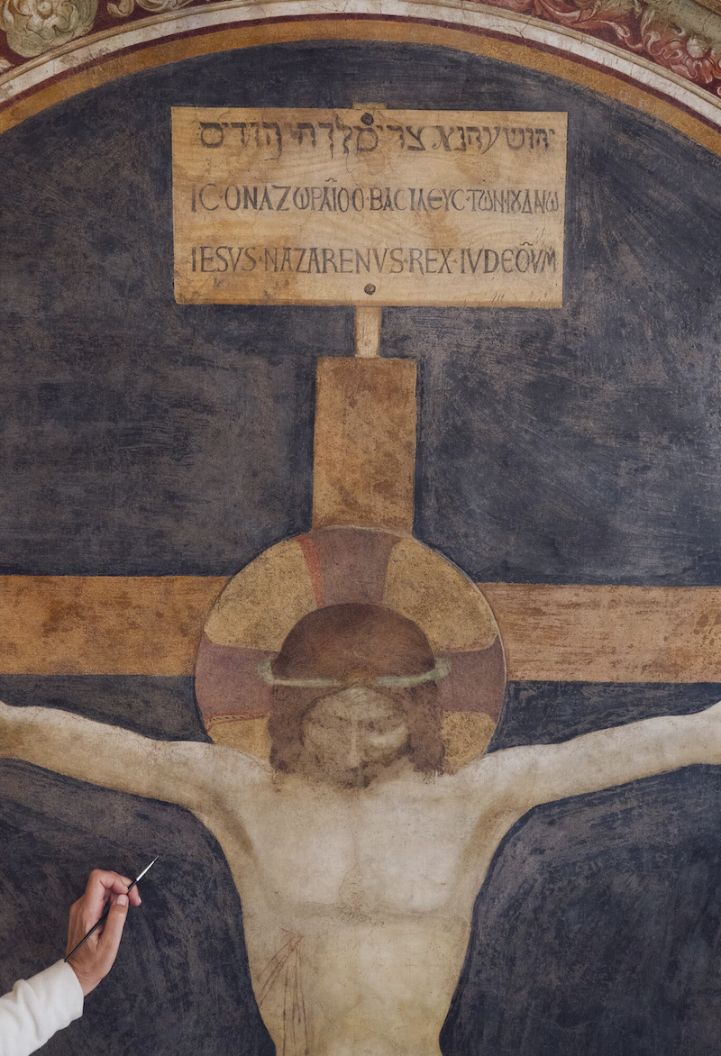 而在今年4月,在佛罗伦萨的山顶小镇菲耶索莱的圣多梅尼科修道院里,人们发现了安杰利科创作的壁画《耶稣受难图》。之后,两位修复人员爬上修道院分会大厅的脚手架,轻轻地擦拭着环绕着基督的蓝色背景,并为他们的修复工作做最后的润色。这幅壁画中,基督低着头,双手握拳,展现出一种冥想的场景,与修道院的大厅十分契合。