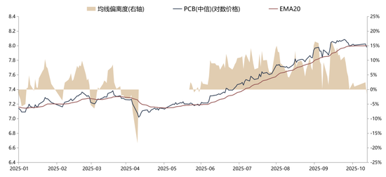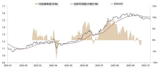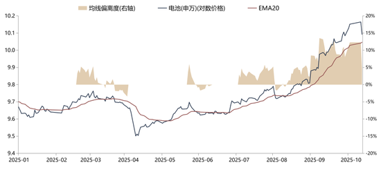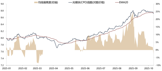 最后,我们在周报《如何区分主线是调整还是终结?20250914》中提出均线偏离度指标,以衡量主线行情趋势的强弱:均线偏离度=ln(Close)-ln(ema20),数值近似代表偏离百分比。