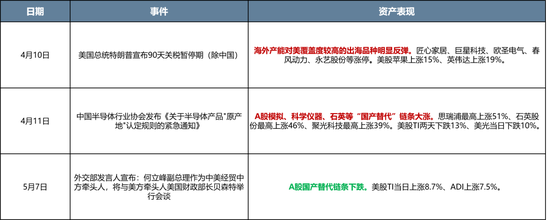 第二阶段:中国对半导体制裁&美国对多数经济体90天豁免:关税交易开启——国产替代链&对美出口链。