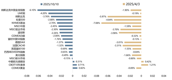 北京时间10月10日深夜,特朗普推文引发全球大类资产波动,截止当日海外收盘,股债汇齐齐下跌。不过与特朗普4月份宣布全面对等关税相比,当日美股、美元指数、原油跌幅小于4月,中概股、铜价跌幅大于4月。