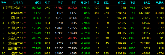 2025年10月13日,早盘开盘,国内期货主力合约涨跌不一。(欧线)跌近5%,跌近4%,SC跌超3%;涨幅方面,沪金涨超1%,、涨近1%。
