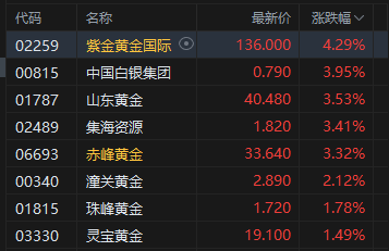 港股黄金股多数高开,紫金黄金国际涨超4%,涨近4%,、赤峰黄金涨超3%。