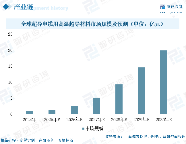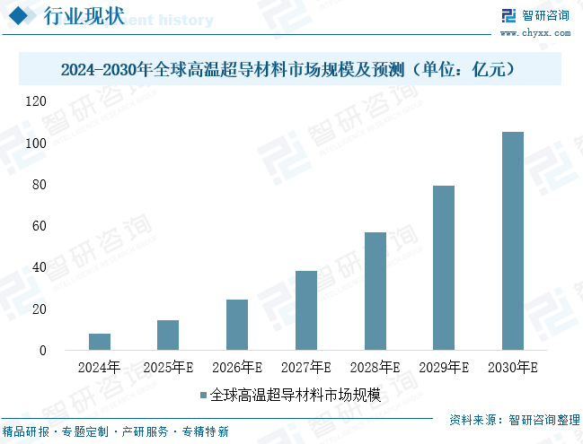 高温超导材料作为21世纪极具战略价值与产业爆发力的前沿新材料,正加速突破实验室边界,在能源传输、医疗影像、磁悬浮交通、国防装备及大科学装置等领域开启规模化应用新篇章。伴随可控核聚变装置磁体系统、智能电网超导限流器、高端医疗MRI设备等核心场景的技术突破与商业化落地,全球高温超导产业进入高速增长通道。数据显示,2024年全球市场规模已跃升至7.9亿元,同比激增77.3%;预计至2030年将突破百亿规模,达105亿元,期间年复合增长率持续保持53.9%的强劲态势,成为新材料领域更具颠覆性潜力的赛道之一。