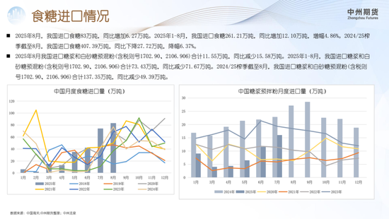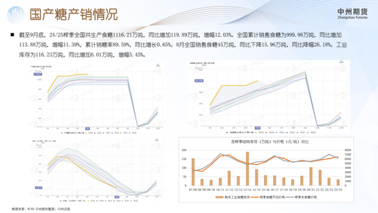 (3)新疆之一家糖厂预计于9月23日开机,拉开25/26制糖期新疆生产序幕,同比推迟一天。内蒙甜菜产区陆续开机,北方生产供应逐渐走向宽松。24/25榨季广西结转工业库存44.21万吨,同比增加17.07万吨。24/25榨季云南结转工业库存20.47万吨 去年同期增加11.18万吨,甘蔗产区结转库存偏高。