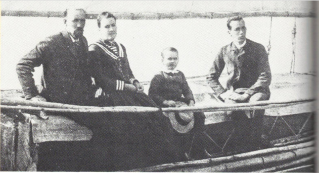 斯洛卡姆船长与“自由”号船员——海蒂、加菲尔德和维克多的合照,摘自《“自由”号之旅》,1894年