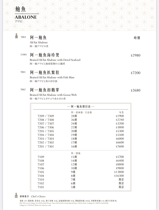 香港总店的鲍鱼,个头比较小的都要1900港元一只,个头大的要一万多港元,更大的甚至不标价,只接受预定。