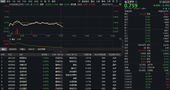 或受海外事件影响,化工板块今日(10月13日)深度回调,反映化工板块整体走势的化工ETF(516020)持续低位震荡,截至发稿,场内价格跌3.19%。