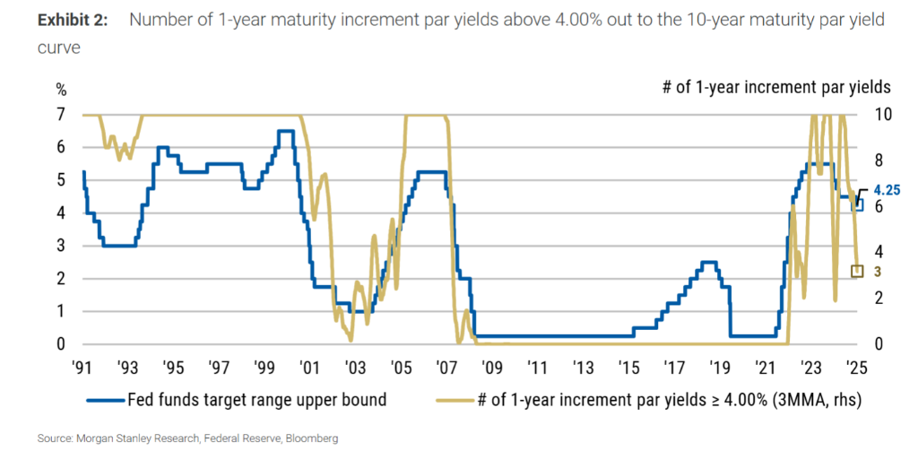 基于对宏观前景的判断,摩根士丹利建议投资者调整其固收策略。报告指出,目前在10年期以内的国债收益率曲线上,仅有8年、9年和10年期三个期限的票面收益率仍高于4%。