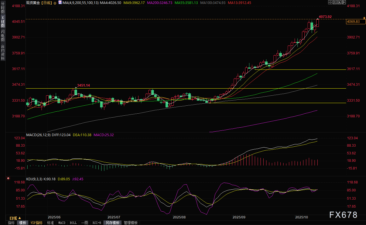 北京时间13:30,现货黄金现报4072.38美元/盎司。