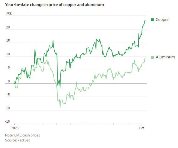 上周,国际现货价格史上首度突破了每盎司4000美元大关,也创下了历史高位,铂金今年以来涨幅则已达80%左右。除贵金属外,铜等工业金属也表现强劲,LME期铜在上周一度触及了11000美元大关。