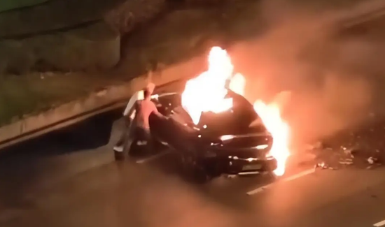 有目击者发视频称,事故发生后,车辆发生自燃,两名市民挥拳砸向驾驶位的车窗处,无果。随后第三名市民跑到车门旁,尝试拉车门,后尝试脚踹,均失败。