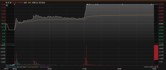 10月13日午后,南京港股价直线拉升,4分钟内封住涨停;也大幅拉升,涨幅一度接近8%;部分航运股也有拉升动作,、一度涨超6%。