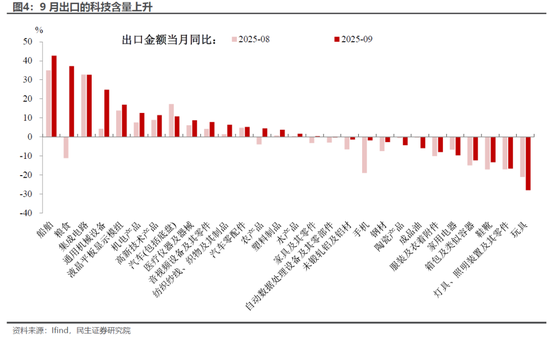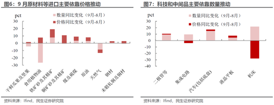 尽管铜、铁矿砂等部分内需相关原材料进口增速边际修复,但拆分量价关系可见,其增速回升更多受价格因素推动(源于9月降息预期下国际大宗商品价格整体上涨),而数量大幅改善的行业仍集中于半导体等中间品与科技产品进口。因此,进口增速的回升存在短期扰动,可持续性仍需谨慎看待。