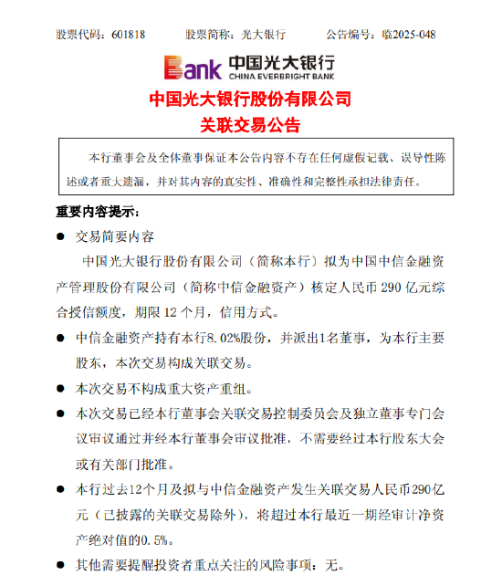 10月13日金融一线消息,发布公告,公司拟为中国中信金融资产管理股份有限公司核定人民币290亿元综合授信额度,期限12个月,信用方式。中信金融资产持有光大银行8.02%股份,并派出1名董事,为本行主要股东,本次交易构成关联交易。