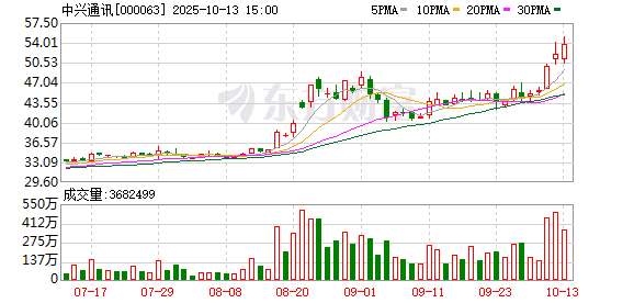 证券时报·数据宝统计显示,中兴通讯今日收盘价为53.67元,上涨3.21%,日换手率为9.14%,成交额为193.18亿元,全天主力资金净流入2.95亿元,近5日该股累计上涨20.69%,近5日资金合计净流入44.61亿元。