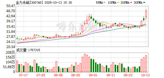 证券时报·数据宝统计显示,金力永磁今日收盘价为46.90元,上涨17.60%,日换手率为15.54%,成交额为77.06亿元,全天主力资金净流出3356.44万元,近5日该股累计上涨35.31%,近5日资金合计净流入1.02亿元。