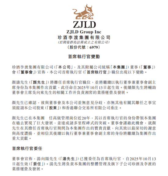 10月13日,珍酒李渡集团(6979.HK)发布高管任命公告:汤向阳任集团首席执行官,颜涛任集团执行董事兼董事会副主席,两项任命即日生效。
