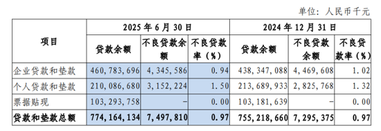 截至2025年上半年末,上海农商银行贷款和垫款总额7741.64亿元,较上年末增长2.51%。其中,个人贷款和垫款余额2100.87亿元,较上年末减少1.69%,不良贷款率1.50%,较上年末上升0.18个百分点。
