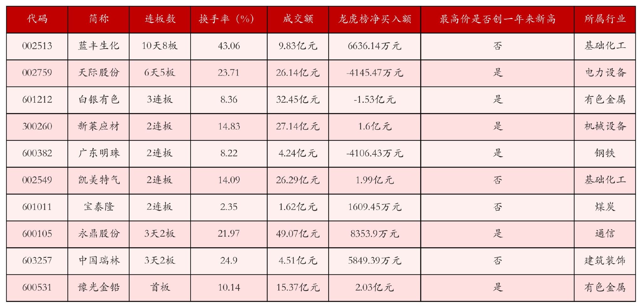 截至10月13日收盘,上证综指下跌0.19%,收于3889.5点,深证成指下跌0.93%,收于13231.47点,创业板指下跌1.11%,收于3078.76点。今日沪深两市A股共计72只涨停,综合当前连板数以及当日龙虎榜数据,其中较为强势的前三只个股分别为:(002513)、(002759)与(601212)。今日强势个股前10位具体数据见下表: